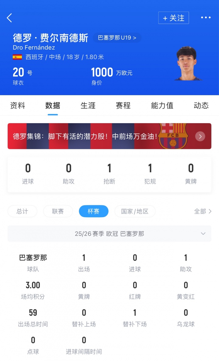 德罗·费尔南德斯现年18岁,2022年加入巴萨青训,目前德转身价1000万欧。本赛季他为巴萨一线队出场5次,欧冠比赛贡献1次助攻。